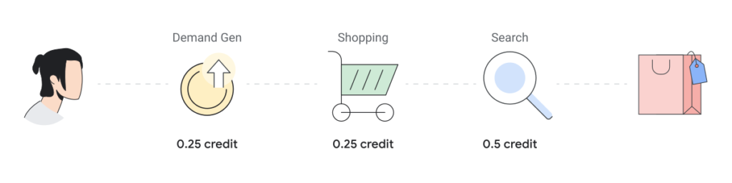 Призначення цінності конверсії в Google. Якщо ви використовуєте модель атрибуції на основі даних і користувач здійснює конверсію, її цінність розподіляється між різними точками взаємодії в Google. У прикладі нижче для цього враховуються різні аспекти, зокрема фактичний внесок кожної взаємодії з оголошенням на шляху до конверсії.