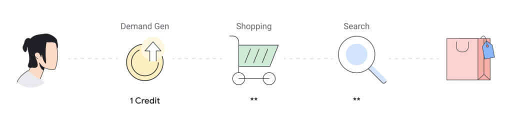 Нова методологія призначення цінності конверсії в кампаніях для створення попиту. Остання кампанія для створення попиту на шляху до конверсії отримує всю цінність. У прикладі нижче кампанія для створення попиту отримує всю цінність, хоч і не показується останньою.