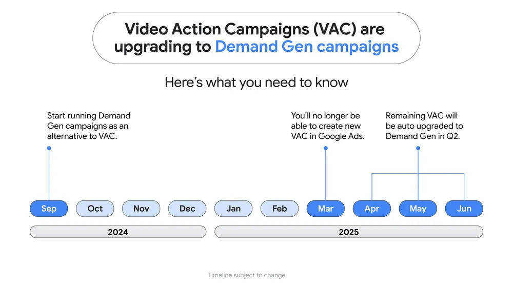- Початок 2025 року: Google запровадить інструмент міграції для ручного оновлення від VAC до Demand Gen.