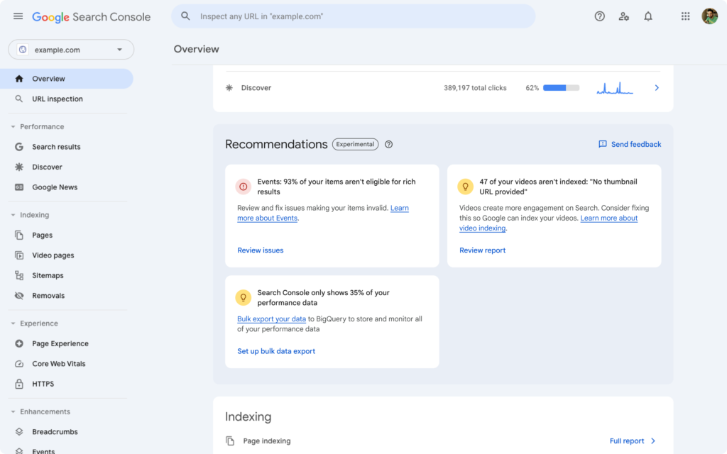 Рекомендації з’являться на сторінці огляду Search Console. Це все ще експериментальна функція, і на цьому етапі не всі сайти матимуть рекомендації, ми будемо повільно розгортати цю функцію протягом наступних місяців. Зауважте, що навіть після повного розгортання ми надаватимемо рекомендації лише тоді, коли матимемо рекомендацію для вашого вебсайту.