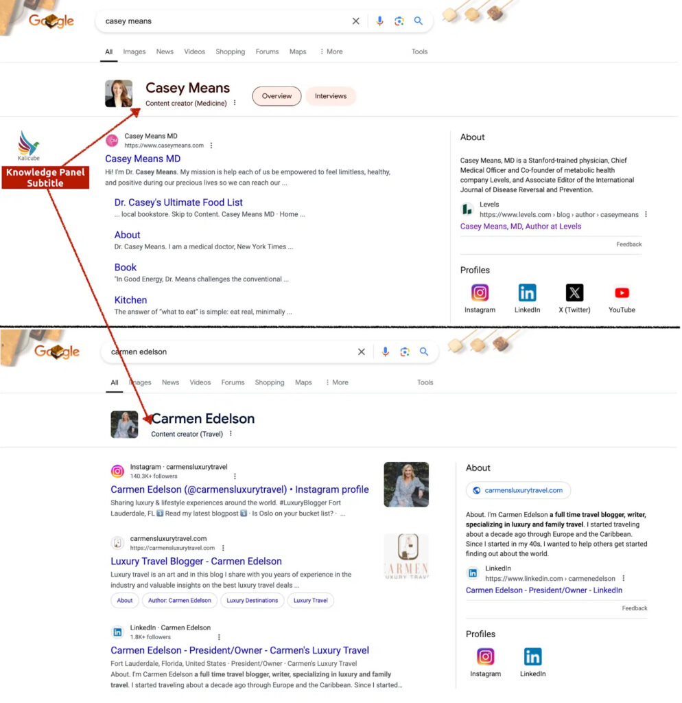 Тепер Google виділяє авторів вмісту як надійні джерела в результатах пошуку. Jason Barnard виявив такі субтитри на панелі знань, як «Творець вмісту (медицина)» і «Творець вмісту (подорожі)» у результатах пошуку. Це свідчить про те, що Google чітко визначає осіб як авторитетних творців вмісту в певних сферах.