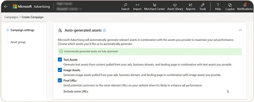 Microsoft Ads також випускає параметри автоматично згенерованих об’єктів на рівні кампанії, а також можливість блокувати окремі автоматично згенеровані текстові об’єкти, щоб допомогти рекламодавцям, які хочуть краще керувати типами об’єктів, які створюються в PMAX кампанії та цільові сторінки, на які вони спрямовують своїх користувачів.