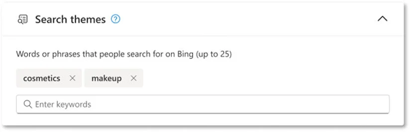 - Нарешті, теми пошуку доступні для пілотування в Performance Max. Це слова чи фрази, які ви пов’язуєте з кампанією, щоб допомогти Microsoft Advertising оптимізувати вашу кампанію протягом періоду навчання. Щоб увімкнути цей пілот, зверніться до свого менеджера облікового запису або зв’яжіться зі службою підтримки.