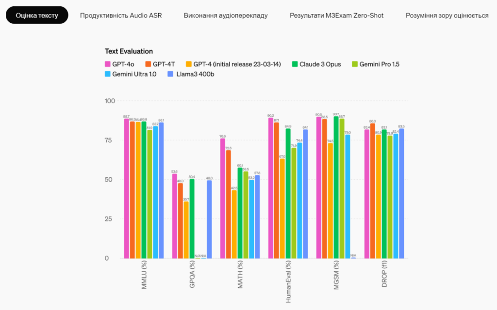 Згідно з традиційними тестами, GPT-4o досягає продуктивності GPT-4 Turbo на рівні тексту, міркувань і кодування, встановлюючи при цьому нові високі водяні знаки для багатомовних, аудіо- та візуальних можливостей.